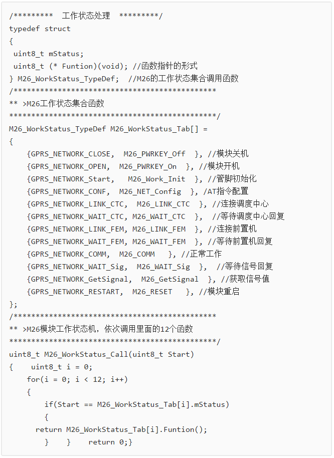 一個GPRS模塊聯(lián)網的小項目,使用過的同學大概知道2G、4G、NB等模塊要想實現無線聯(lián)網功能都需要經歷模塊上電初始化、注冊網絡、查詢網絡信息質量、連接服務器等步驟,這里的的例子就是,利用一個狀態(tài)機函數(根據不同狀態(tài)依次調用不同實現方法的函數),通過回調函數的方式依次調用不同的函數,實現模塊聯(lián)網功能,如下: