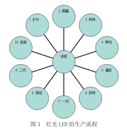 圖 3 為紅光 LED 的生產(chǎn)流程 ,依次是擴(kuò)片、固晶、烘烤、焊線、灌膠、烘烤、一切、測(cè)試、二切和包裝。其中主要的工序是固晶、焊線、灌膠和測(cè)試