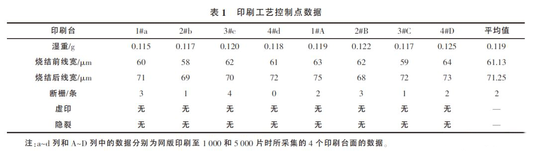 整個(gè)試驗(yàn)過程不更換網(wǎng)版和漿料。其中,網(wǎng)版規(guī)格為400目90線,副柵設(shè)計(jì)寬度為43μm,線徑18μm,膜厚(14±2)μm,張力(26±2)N。實(shí)際工藝控制點(diǎn)數(shù)據(jù)見表1。