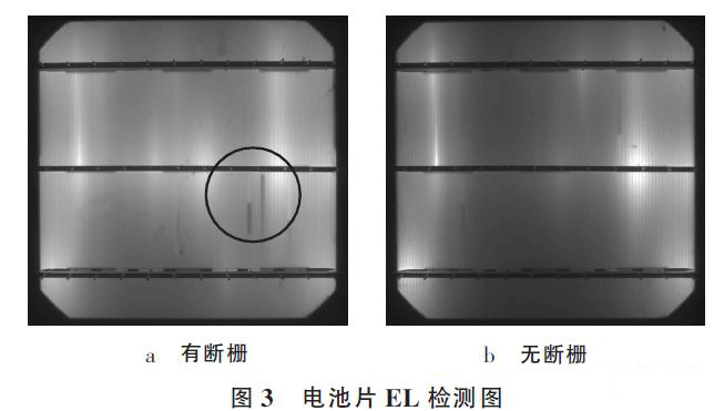 由圖3可知,電池片電致發(fā)光圖像均勻、明亮,說明材料本身無缺陷,符合太陽(yáng)能及硅材料質(zhì)量標(biāo)準(zhǔn)。同時(shí),也說明前序工藝過程未造成工藝污染。此外,平均單片斷柵條數(shù)小于3,斷柵造成的暗區(qū)長(zhǎng)度不超過3cm,完全在工藝可控范圍之內(nèi),且基本無虛印、隱裂、粗線和波浪線等不良印刷現(xiàn)象。