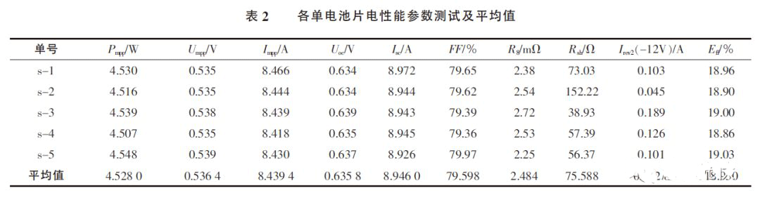 在前序工藝保持一致性的同時(shí),采用上述絲網(wǎng)印刷工藝方案實(shí)施正面電極印刷,并隨機(jī)選取5單(每單200片)作為試驗(yàn)測(cè)試目標(biāo),單號(hào)分別記作s-1、s-2、s-3、s-4、s-5。經(jīng)正面電極印刷、燒結(jié)后采用德國(guó)Berger公司AAA級(jí)太陽(yáng)能模擬器在輻照度為1000W/m2的標(biāo)準(zhǔn)條件下對(duì)成品電池片進(jìn)行電性能測(cè)試,每單電池片各項(xiàng)電性能參數(shù)測(cè)試平均值見表2。