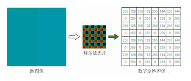 如果在 CCD 表面覆蓋一個只含紅綠藍三色的馬賽克濾鏡,再加上對其輸出信號的處理算法,就可以實現(xiàn)一個 CCD 輸出彩色圖像數(shù)字信號。由于這個設(shè)計理念最初由拜爾(Bayer)先生提出,所以這種濾鏡也被稱作拜爾濾鏡。