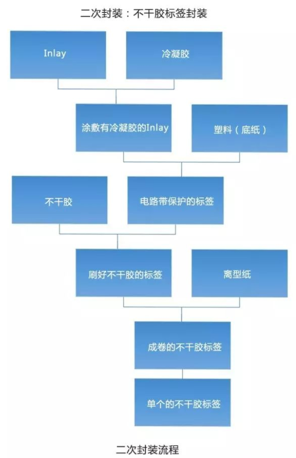 傳統(tǒng)的自粘不干膠電子標(biāo)簽用標(biāo)簽復(fù)合設(shè)備完成封裝加工過程。標(biāo)簽結(jié)構(gòu)由面層、芯片線路(Inlay)層、膠層、底層組成。面層可以用紙、PP、PET作覆蓋材料(印刷或不印刷)等多種材質(zhì)作為產(chǎn)品的表面,應(yīng)用涂布設(shè)備將冷凝膠涂敷到Inlay層上,再加上塑料材質(zhì)的底油,通過與印刷好的上下底料相結(jié)合,形成大張的成品標(biāo)簽卡,再通過印刷、層壓、沖切等形成符合ISO-7810卡片標(biāo)準(zhǔn)尺寸,也可按需加工成異形等形式,。一次封裝流程紙,就型成電路帶保護(hù)的標(biāo)簽,再刷上膠,和離型紙結(jié)合,就形成了成卷不干膠電子標(biāo)簽,再經(jīng)過模切等工序,就形成了單個(gè)的不干膠電子標(biāo)簽。