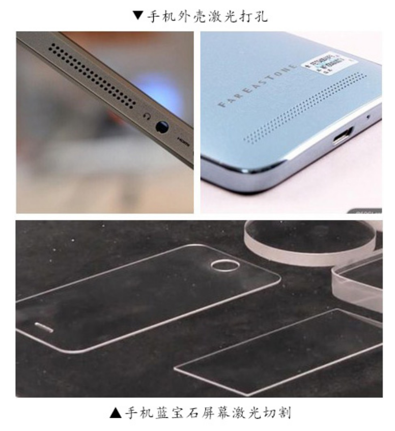 激光切割:藍(lán)寶石玻璃手機(jī)屏幕激光切割、攝像頭保護(hù)鏡片激光切割、手機(jī)Home鍵激光切割、FPC柔性電路板激光切割、手機(jī)聽筒網(wǎng)激光打孔等。