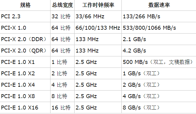 PCI-X目前的最新版本是2.0。下面講的的1.0版本,在外觀上,它與64位PCI接口差不多。目前主要有100MHz和133MHz兩種外頻模式,不過(guò)目前主要用的是133MHz PCI-X接口,理論共享傳輸速率達(dá)到了1.06GB/s。后來(lái)推出的2.0版本,頻率位266MHz和533MHz,共享傳輸速率為2.1GB/s和4.2GB/s。后來(lái)出的3.0標(biāo)準(zhǔn)1066MHz在PCI-E的沖擊下沒(méi)有了下文。