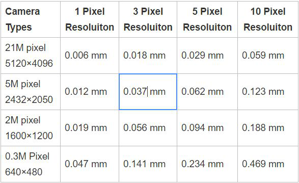 精度的單位是mm。根據(jù)產(chǎn)品表面和照明狀況的不同,我們可以通過(guò)放大圖像觀察辨別穩(wěn)定像素的個(gè)數(shù),從而得出精度。如果條件不允許實(shí)際測(cè)試觀察,一般的規(guī)律是,如果使用正面打光,有效像素為1個(gè),使用背光,有效像素為0.5個(gè)。