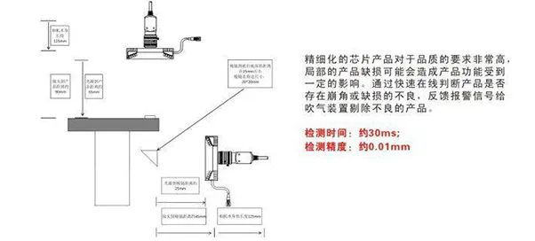 精細(xì)化的芯片產(chǎn)品對(duì)于品質(zhì)的要求非常高,局部的產(chǎn)品缺損可能會(huì)造成產(chǎn)品功能受到一定的影響。通過(guò)快速在線(xiàn)判斷產(chǎn)品是否在崩角或缺損的不良。反饋報(bào)警信號(hào)給吹氣裝置剔除不良的產(chǎn)品。
