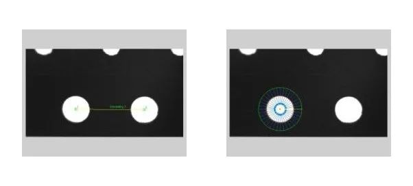 通過(guò)電池表面的圓孔特征,進(jìn)行圓心擬合計(jì)算;并計(jì)算圓心連線(xiàn)的角度以及中心圓孔的相對(duì)位置,進(jìn)行電池產(chǎn)品的精確定位計(jì)算。