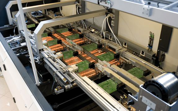 在BT樹脂/玻璃芯板的兩面層壓極薄(12~18μm厚)的銅箔,然后進(jìn)行鉆孔和通孔金屬化。用常規(guī)的PCB加3232藝在基板的兩面制作出圖形,如導(dǎo)帶、電極、及安裝焊料球的焊區(qū)陣列。然后加上焊料掩膜并制作出圖形,露出電極和焊區(qū)。為提高生產(chǎn)效率,一條基片上通常含有多個PBG基板。