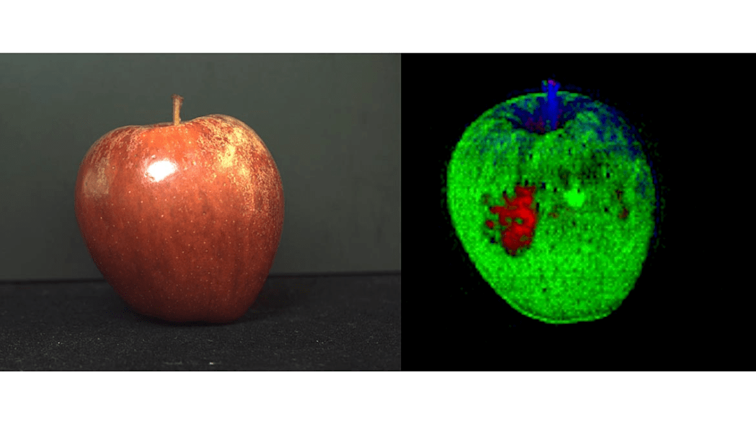 圖 4.高光譜圖像中的紅色區(qū)域顯示彩色圖像中不可見(jiàn)的非表面瘀傷