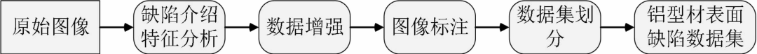 所以需要對(duì)所用鋁型材表面缺陷數(shù)據(jù)集進(jìn)行特征分析,數(shù)據(jù)增強(qiáng)和數(shù)據(jù)集的制作等操作。鋁型材表面缺陷數(shù)據(jù)集構(gòu)建步驟如圖所示。