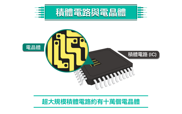 晶體管就像是數(shù)字信號的「收音機(jī)」──收音機(jī)的原理是將微弱的信號放大、用喇叭發(fā)聲出來,晶體管能將信號的電流放大;而數(shù)字信號是由0與1組成,1代表著電流「開」、0代表著電流「關(guān)」,晶體管以每秒超過 1千億次的開關(guān)來運作,讓電流以特定方式通過。