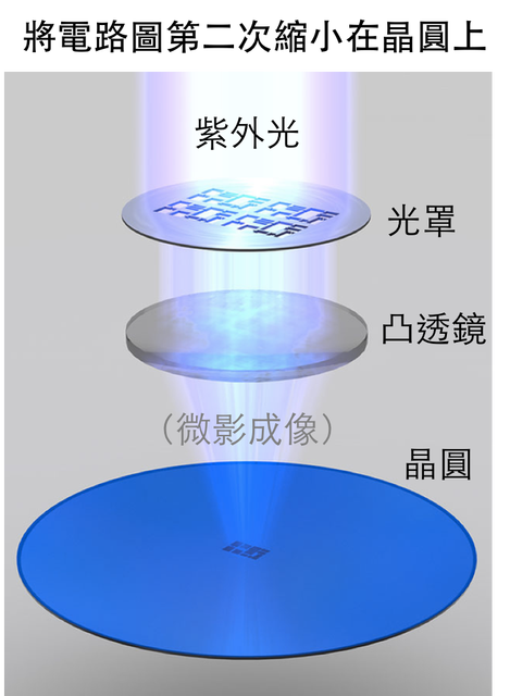 晶圓上面會事先涂上一層光阻 (相片感光材料),透過紫外光的照射與凸透鏡聚光效果、會將光罩上的電路結(jié)構(gòu)縮小并烙印在晶圓上,最后印在晶圓上的半導(dǎo)體回路會從光罩的 1 微米、變?yōu)?0.1 微米。陰影以外的部分會被紫外光破壞,隨后能被沖洗液洗掉。