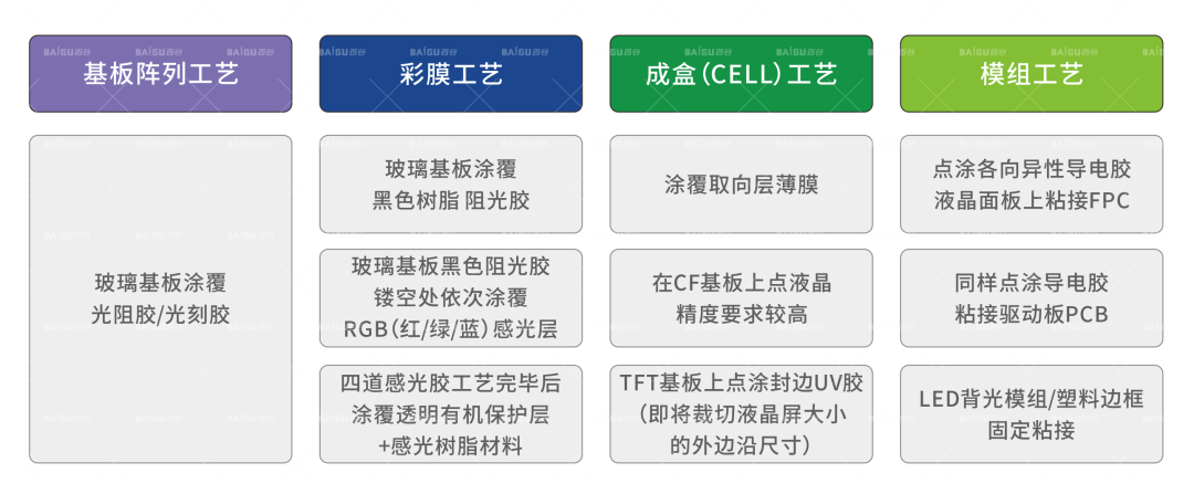 LCD整個生產(chǎn)流程中,點(diǎn)膠工藝主要集中在以下幾個階段,膠水包含液晶、保護(hù)膠、感光膠/光刻膠、UV膠等幾種。