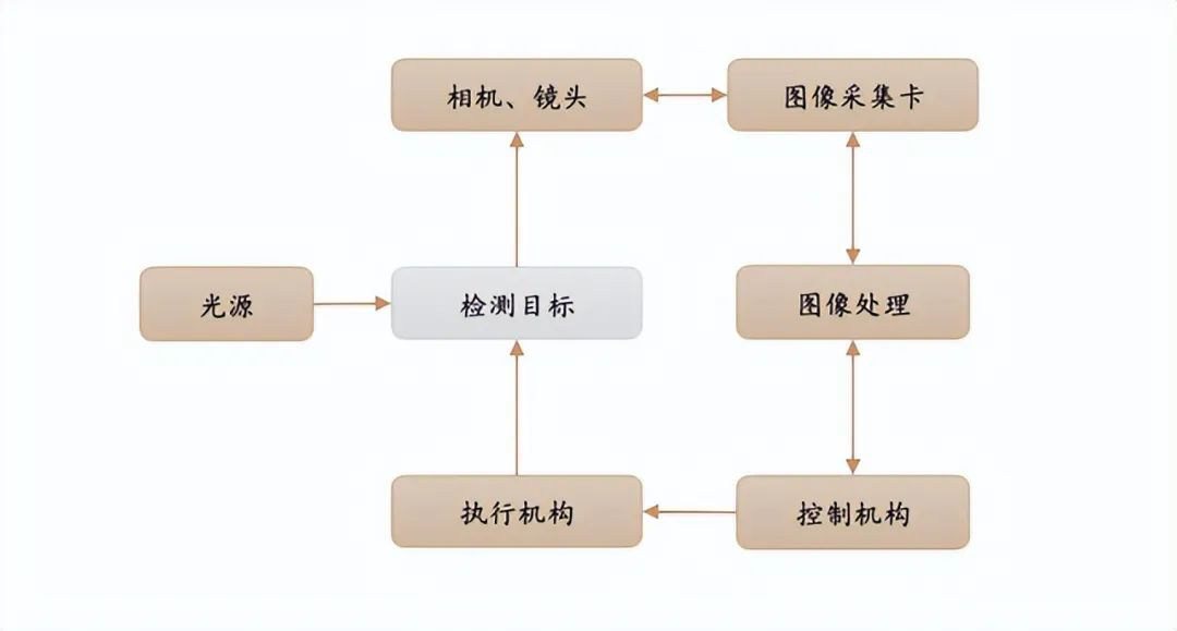 在一個(gè)典型的機(jī)器視覺(jué)系統(tǒng)中,光源及光源控制器、鏡頭、相機(jī)等硬件部分負(fù)責(zé)成像,視覺(jué)控制系統(tǒng)負(fù)責(zé)對(duì)成像結(jié)果進(jìn)行處理分析、輸出分析結(jié)果至智能設(shè)備的其他執(zhí)行機(jī)構(gòu)。機(jī)器視覺(jué)應(yīng)用系統(tǒng)包括圖像捕捉、光源系統(tǒng)、圖像數(shù)字化模塊、數(shù)字圖像處理模塊、智能判斷決策模塊和機(jī)械控制執(zhí)行模塊。