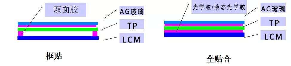 我們手機電腦的屏幕是液晶屏,從屏幕的結構上看,可以大致分成3個部分,從上到下分別是保護玻璃,觸摸屏、顯示屏。把這三部分粘起來的方式就是貼合方式,可以稱為全貼合和框貼。