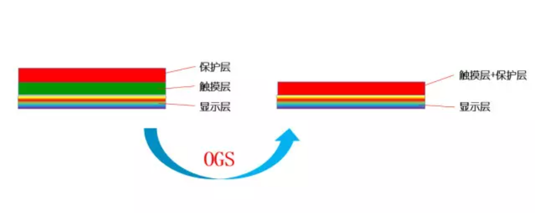 OGS技術(shù)就是把觸控屏與保護(hù)玻璃集成在一起,在保護(hù)玻璃內(nèi)側(cè)鍍上ITO(氧化銦錫,一種透明導(dǎo)電材料)導(dǎo)電層,直接在保護(hù)玻璃上進(jìn)行鍍膜和光刻,由于節(jié)省了一片玻璃和一次貼合,觸摸屏能夠做的更薄且成本更低。市面上大部分手機(jī)都是采用OGS貼合技術(shù)。