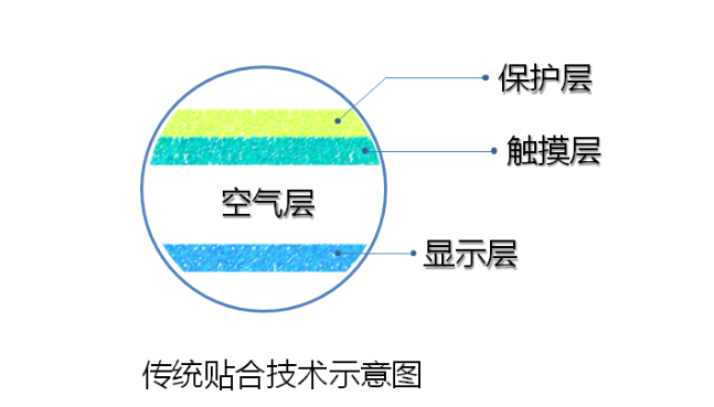 傳統(tǒng)貼合工藝,就是把保護玻璃和觸摸層完全貼合,再與顯示層進行邊框貼合,中間會有空氣層。