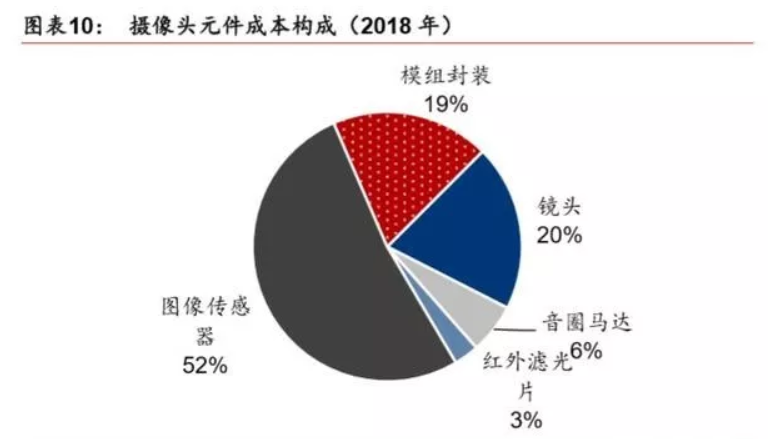 根據(jù)前瞻產(chǎn)業(yè)研究院估算,2018年單顆攝像頭成本構(gòu)成中,約52%來(lái)自于圖像傳感器、 20%來(lái)自于鏡頭、19%來(lái)自于模組封裝,僅6%和3%來(lái)自于音圈馬達(dá)和紅外濾光片。目前,圖像傳感器可分為CCD(電荷耦合器件)傳感器和 CMOS(互補(bǔ)金屬氧化物半導(dǎo)體) 傳感器(CIS)兩大類(lèi)。CCD圖像傳感器是一種用于捕捉圖像的感光半導(dǎo)體芯片,其所捕捉到的畫(huà)面中每個(gè)像素的電荷數(shù)據(jù)會(huì)依次傳送到下一個(gè)像素中,由最底端輸出后經(jīng)傳感器邊緣放大后輸出。CIS是將圖像信息經(jīng)光電轉(zhuǎn)換后產(chǎn)生電流或電壓信號(hào),在CMOS晶體管開(kāi)關(guān)陣列中直接讀取,無(wú)需逐行讀取,因此在靈活性和集成度上顯著優(yōu)于CCD。圖像傳感器尺寸是影響感光元件成像效果的關(guān)鍵因素,即傳感器尺寸越大,感光面積越大,成像效果越好。