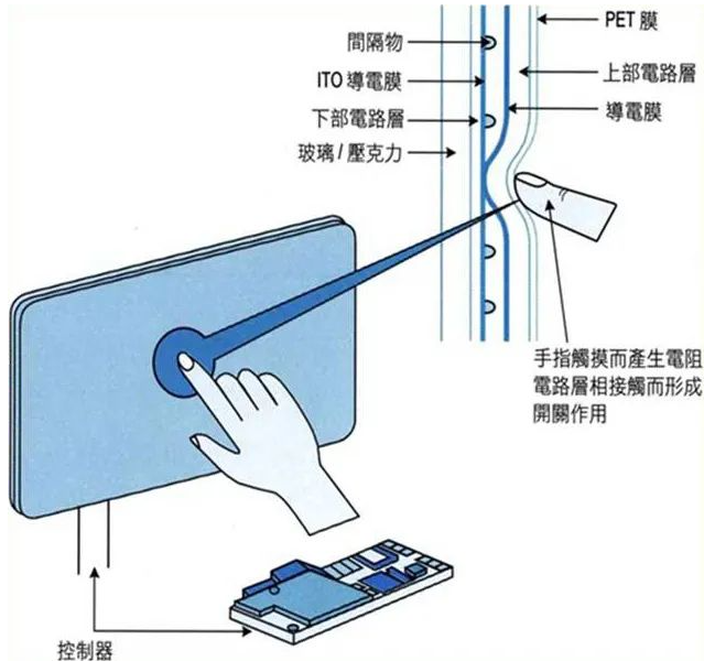 工作原理:電阻式觸屏是一種軟屏,主要原理是利用壓力傳感器檢測屏幕各處的壓力,以此來輸入信息。
