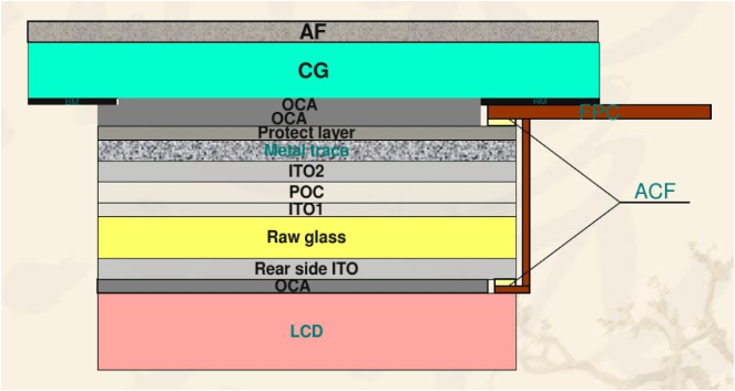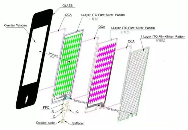 OGS(One Glass Solution):一塊玻璃的解決方案。觸摸屏和保護玻璃集成在一起,在保護玻璃內(nèi)側(cè)鍍上ITO導電層。優(yōu)點是使得TP更薄,成本更低,透光性更好。