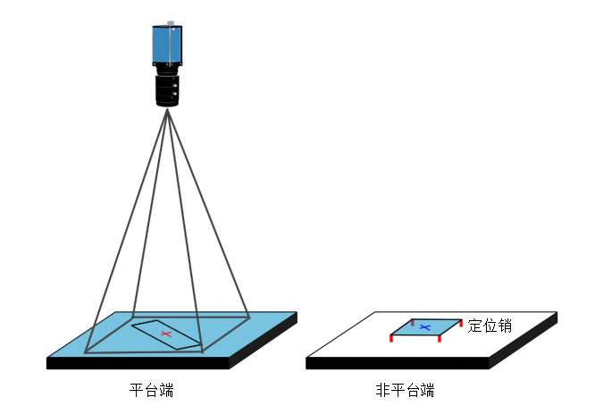 說明:三Mark自對位有單相機和三相機兩種情況,相機都是在平臺端。單相機模型拍攝完一個交點后移動位置拍攝另一個交點,三相機模型的三個相機分別拍攝三個交點。非平臺端上的產(chǎn)品通過定位銷或其他方式確保來料都是在相對固定的位置,平臺端的產(chǎn)品來料位置不固定,找出三個交點后,根據(jù)糾偏算法找到偏移量,根據(jù)偏移量將平臺端的產(chǎn)品貼到非平臺端上。