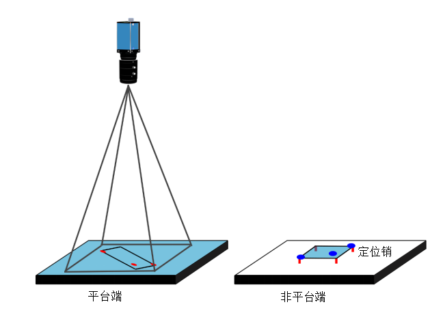 說明:四相機抓邊自對位模型中相機都是在平臺端。四個相機模型的四個相機分別拍攝平臺端矩形產(chǎn)品的四條邊。非平臺端上的產(chǎn)品通過定位銷或其他方式確保來料都是在相對固定的位置,平臺端的產(chǎn)品來料位置不固定。找出四條邊后根據(jù)糾偏算法找到偏移量,根據(jù)偏移量將平臺端的產(chǎn)品貼到非平臺端上。