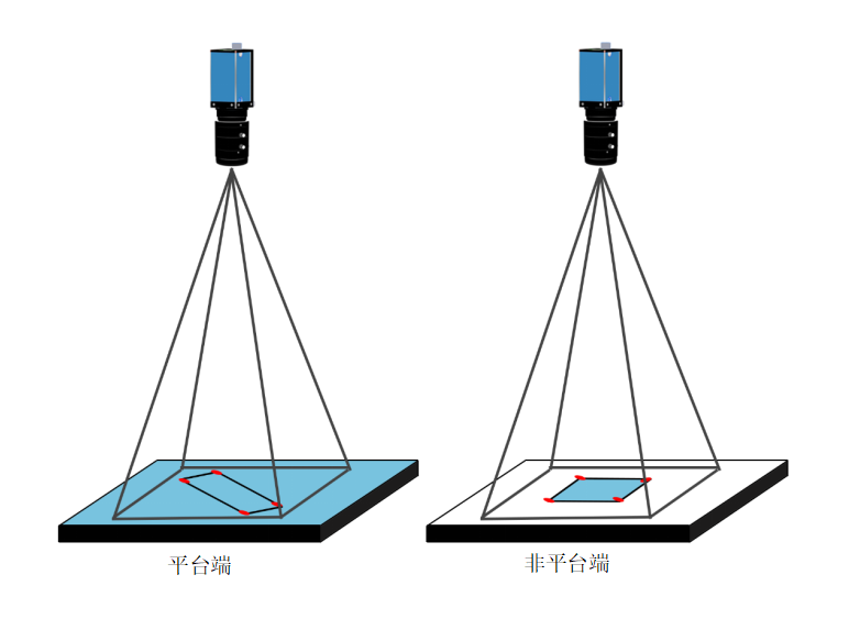 說明:平臺端和非平臺端來料位置都不固定,但Mark與產(chǎn)品的相對位置固定。四個Mark對應(yīng)矩形產(chǎn)品的四個角點。拍攝時確保四個Mark都在相機視野內(nèi)(通常是將產(chǎn)品抓起后再拍攝防止拍完再抓導(dǎo)致產(chǎn)品移動或變形)。根據(jù)糾偏算法找到偏移量。根據(jù)偏移量和兩端相機的映射關(guān)系將平臺端的產(chǎn)品貼到非平臺端上。