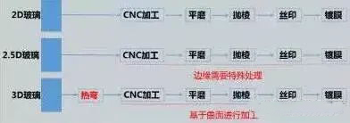 玻璃一般分為2D,2.5D及3D玻璃,2D和2.5D玻璃防護屏產品的生產方法是將玻璃基板進行切割,通過精雕、光孔、拋光、強化、絲印、鍍膜等加工后,制成各種規(guī)格型號的產品。3D曲面玻璃的生產流程與2D和2.5D產品基本相同,最大區(qū)別在于新增熱彎成型設備。