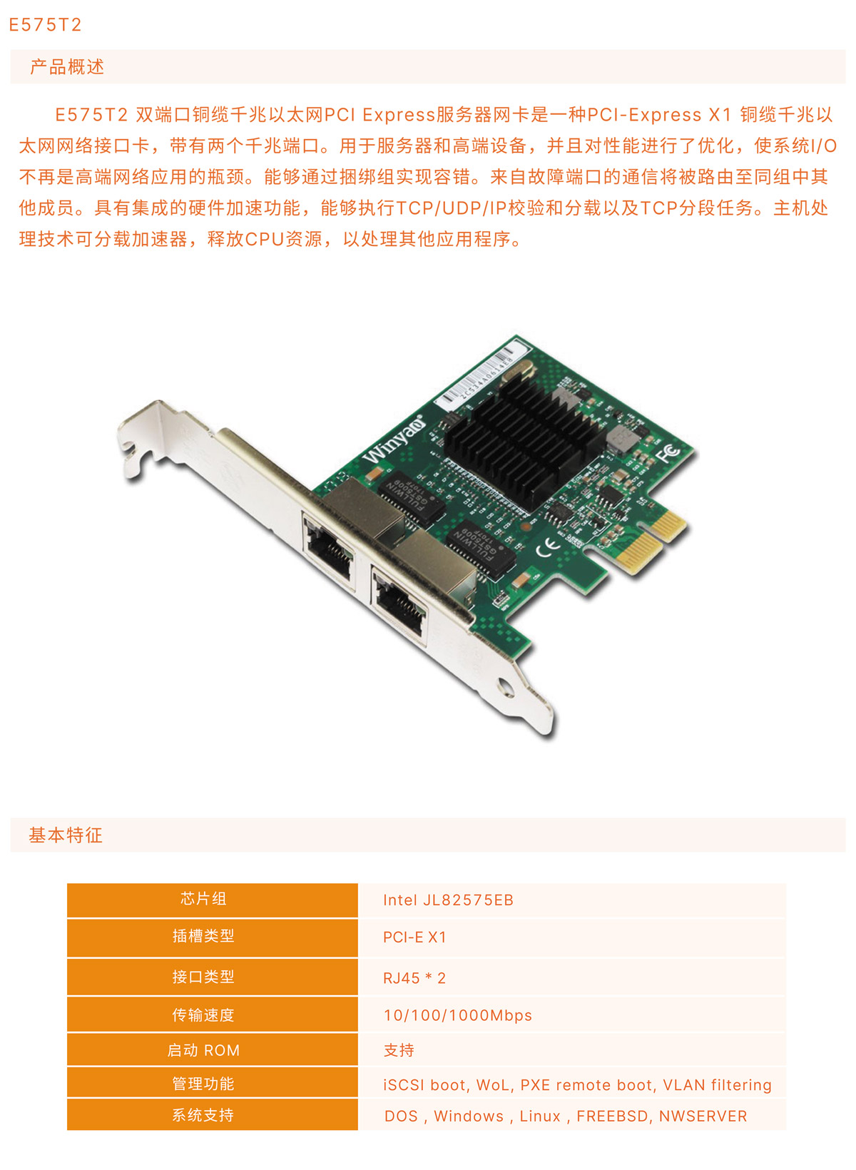E575T2 雙端口銅纜千兆以太網(wǎng)PCI Express服務(wù)器網(wǎng)卡是一種PCI-Express X1 銅纜千兆以太網(wǎng)網(wǎng)絡(luò)接口卡,帶有兩個(gè)千兆端口。用于服務(wù)器和高端設(shè)備,并且對(duì)性能進(jìn)行了優(yōu)化,使系統(tǒng)I/O不再是高端網(wǎng)絡(luò)應(yīng)用的瓶頸。能夠通過(guò)捆綁組實(shí)現(xiàn)容錯(cuò)。來(lái)自故障端口的通信將被路由至同組中其他成員。具有集成的硬件加速功能,能夠執(zhí)行TCP/UDP/IP校驗(yàn)和分載以及TCP分段任務(wù)。主機(jī)處理技術(shù)可分載加速器,釋放CPU資源,以處理其他應(yīng)用程序。